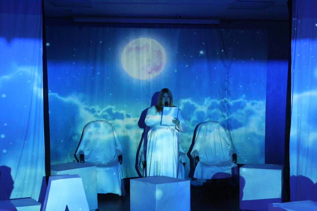 Спектакль был построен на тонком переплетении голосов трех актрис, которые предстали не просто как чтецы, но как хранительницы преданий — духи Памяти, Действия и Души.